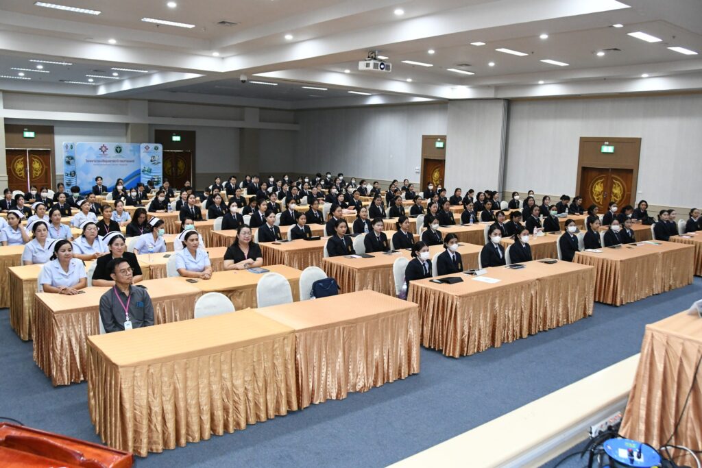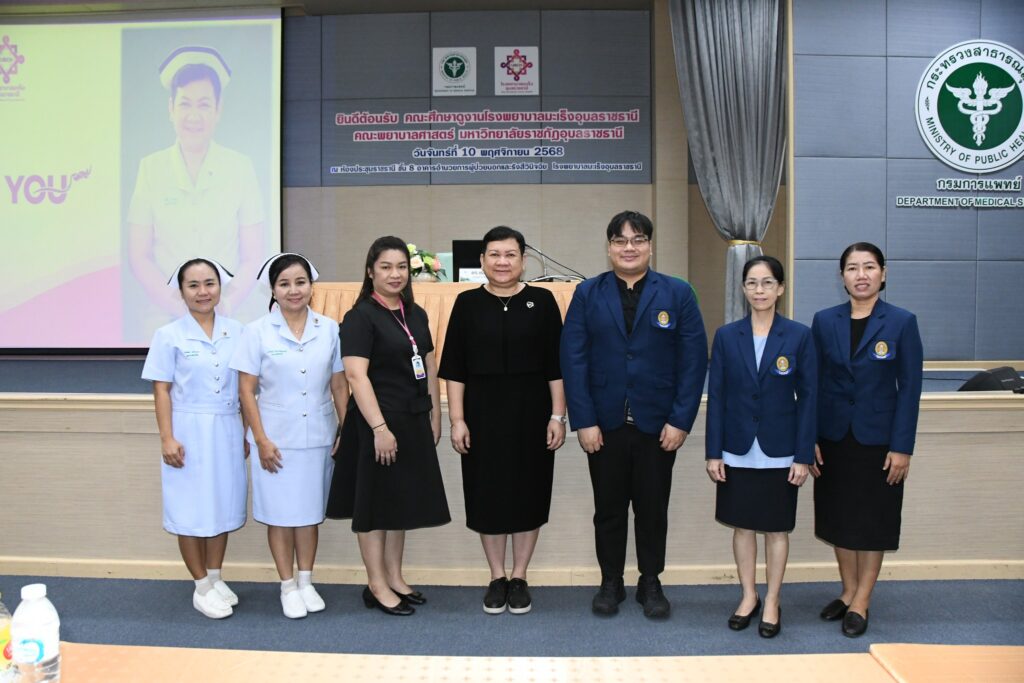 แพทย์หญิงชุติวรรณ วิวัฒนาสิทธิพงศ์ รักษาการในตำแหน่งผู้อำนวยการโรงพยาบาลมะเร็งอุบลราชธานี เป็นประธานกล่าวต้อนรับคณะศึกษาดูงานและศึกษาในคลินิก จากคณะพยาบาลศาสตร์ มหาวิทยาลัยราชภัฏอุบลราชธานี พร้อมด้วยดร.ชลิยา วามะลุน รองผู้อำนวยการด้านการพยาบาล หัวหน้ากลุ่มงาน หัวหน้างาน ร่วมต้อนรับอาจารย์และนักศึกษาหลักสูตรพยาบาลศาสตร์ ชั้นปีที่ 3 ศึกษาดูงานและศึกษาในคลินิก รายวิชาปฏิบัติการพยาบาลผู้ใหญ่และผู้สูงอายุ 2 จำนวน 125 คน นำทีมโดย ผู้ช่วยศาสตราจารย์พรรณงาม วรรณพฤกษ์ และคณาจารย์จากคณะพยาบาลศาสตร์ มหาวิทยาลัยราชภัฏอุบลราชธานี ณ ห้องประชุมราชธานี ชั้น 8 อาคารอำนวยการผู้ป่วยนอกและรังสีวินิจฉัย โรงพยาบาลมะเร็งอุบลราชธานี ในวันที่ 10 พฤศจิกายน 2568