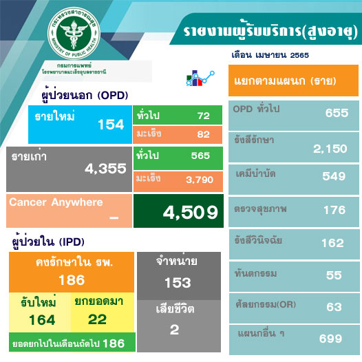 ผู้ป่วยใหม่ 188 ราย เป็นผู้ป่วยทั่วไป 81 ราย และผู้ป่วยมะเร็ง 107 รายผู้ป่วยเก่า 5,523 ราย เป็นผู้ป่วยทั่วไป 710 ราย และผู้ป่วยมะเร็ง 4,813 รายรวมผู้มารับบริการผู้ป่วยนอกทั้งสิ้น 5,711 รายCancer Anywhere – ราย