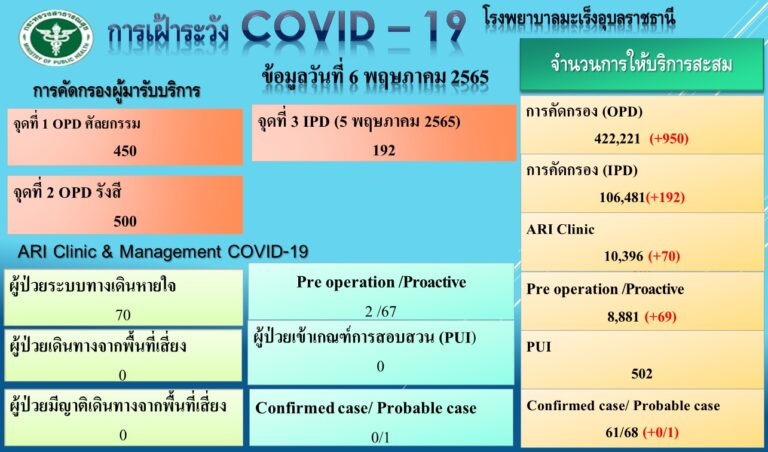 รพ.มะเร็งอุบลราชธานี รายงานเฝ้าระวังโควิด-19 วันที่ 5 พฤษภาคม 2565