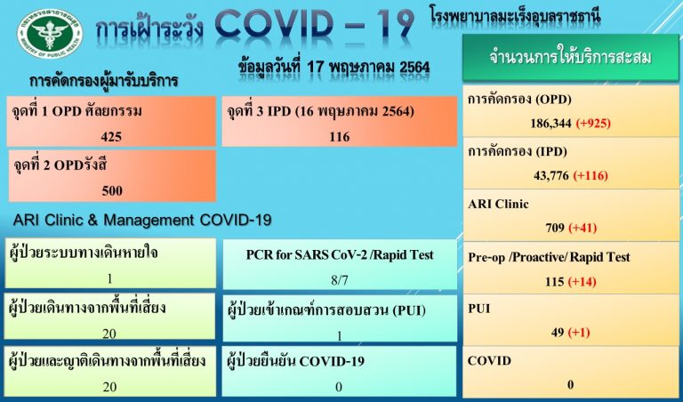 รายงานการเฝ้าระวัง Covid-19 โรงพยาบาลมะเร็งอุบลราชธานี ประจำวันที่ 17 พฤษภาคม 2564 มีรายละเอียดดังต่อไปนี้
