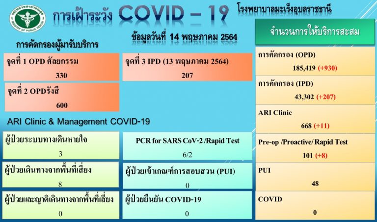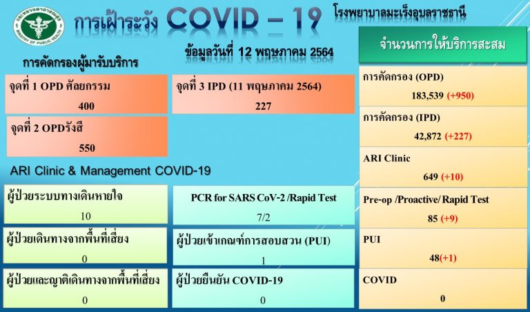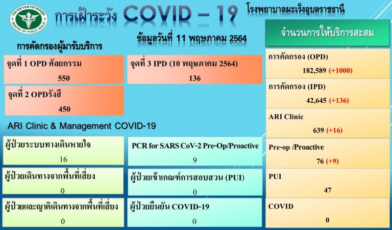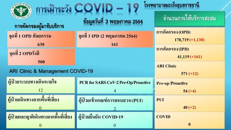 รายงานการเฝ้าระวัง Covid-19 โรงพยาบาลมะเร็งอุบลราชธานี ประจำวันที่ 11 พฤษภาคม 2564 มีรายละเอียดดังต่อไปนี้