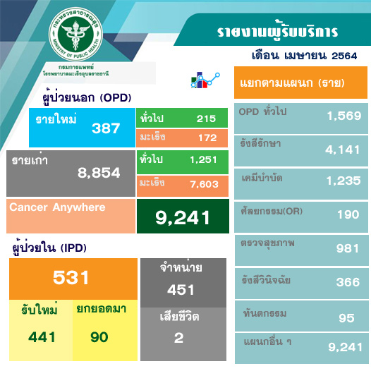OPD ทั่วไป 1,569 รายรังสีรักษา 4,141 รายเคมีบำบัด 1,235 รายห้องผ่าต