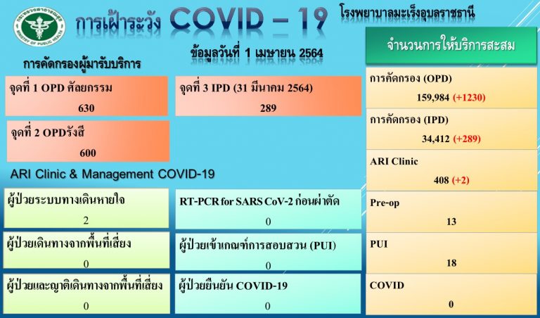 รายงานการเฝ้าระวัง Covid-19 โรงพยาบาลมะเร็งอุบลราชธานี ประจำวันที่ 7 เมษายน 2564 มีรายละเอียดดังต่อไปนี้