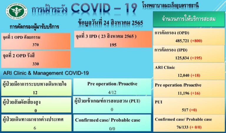 รพ.มะเร็งอุบลราชธานี รายงานเฝ้าระวังโควิด-19 วันที่ 24 สิงหาคม 2565