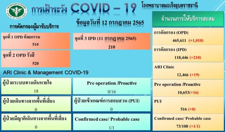 รพ.มะเร็งอุบลราชธานี รายงานเฝ้าระวังโควิด-19 วันที่ 12 กรกฎาคม 2565