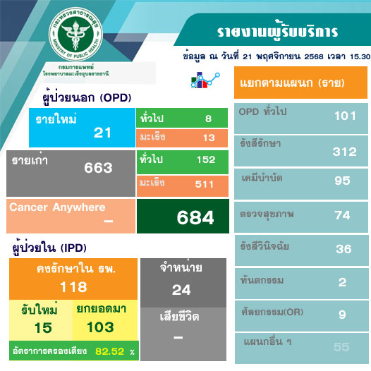 ผู้มารับบริการโรงพยาบาลมะเร็งอุบลราชธานี ณ วันที่ 21 พฤศจิกายน 2568