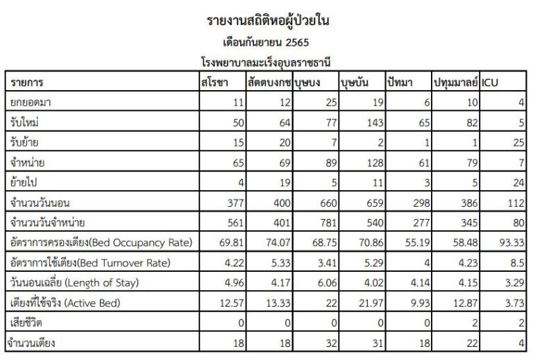 สถิติผู้ป่วยในเดือนกันยายน 2565 แยกตามหอผู้ป่วย