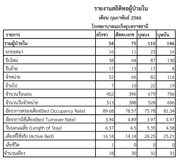 สถิติผู้ป่วยในเดือนกุมภาพันธ์ 2566 แยกตามหอผู้ป่วย