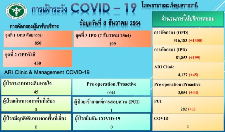รพ.มะเร็งอุบลราชธานี รายงานเฝ้าระวังโควิด-19 วันที่ 8 ธันวาคม 2564
