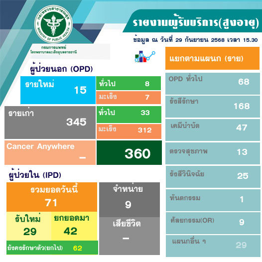 สรุปตัวเลขผู้มารับบริการที่เป็นผู้สูงอายุ(60 ปีขึ้นไป) ที่มาใช้บริการ ณ โรงพยาบาลมะเร็งอุบลราชธานี วันที่ 29 กันยายน 2568 มีรายละเอียดดังต่อไปนี้